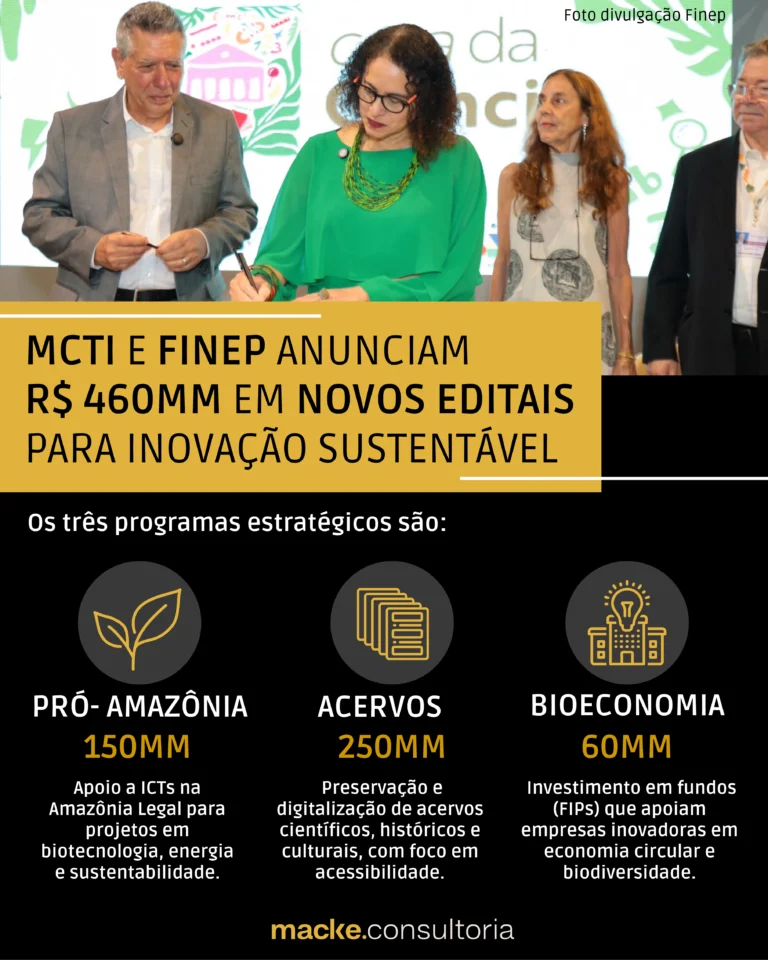 MCTI e Finep anunciam R$ 460 milhões para sustentabilidade na COP30; Macke Consultoria analisa oportunidades