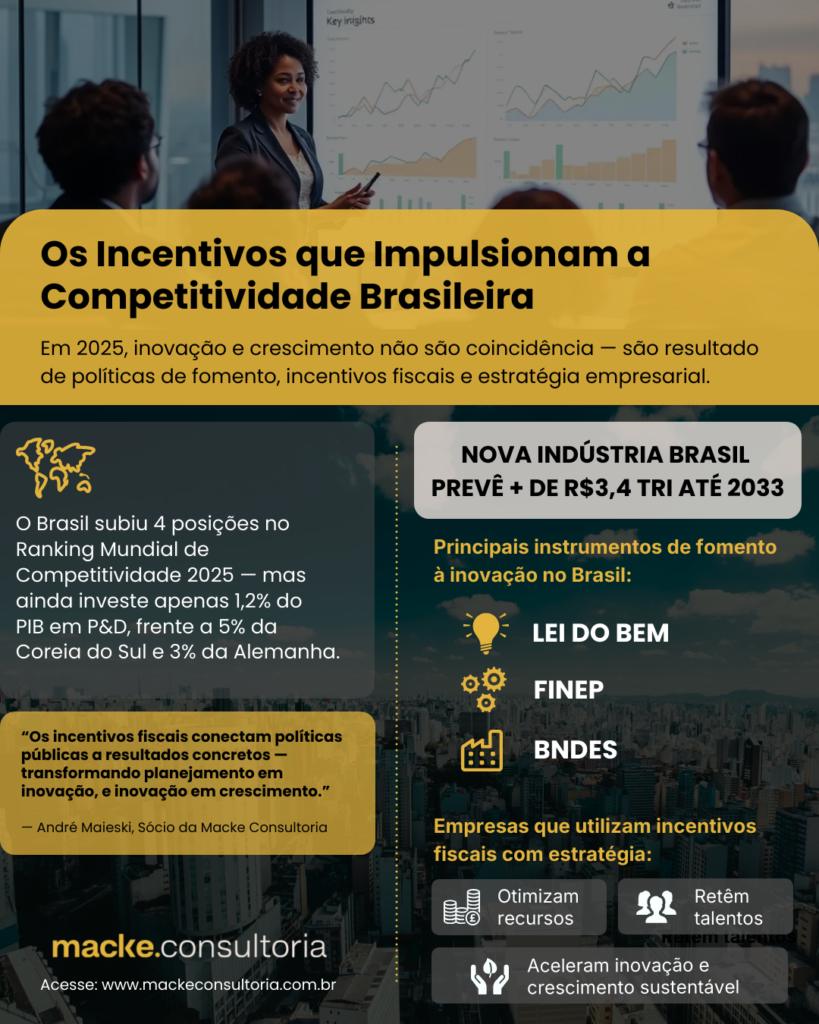 O Brasil tem demonstrado sinais de avanço em sua competitividade global, subindo quatro posições e alcançando o 58º lugar no Ranking Mundial de Competitividade de 2025. No entanto, o país ainda enfrenta um desafio estrutural: o baixo investimento em Pesquisa e Desenvolvimento (P&D), que historicamente patina em torno de 1,2% do PIB, um número distante de potências inovadoras como Coreia do Sul (acima de 5%) e Alemanha (superior a 3%). Nesse contexto, a utilização inteligente de incentivos fiscais e políticas de fomento à inovação deixa de ser uma opção e se torna um pilar estratégico para a sobrevivência e o crescimento das empresas.
