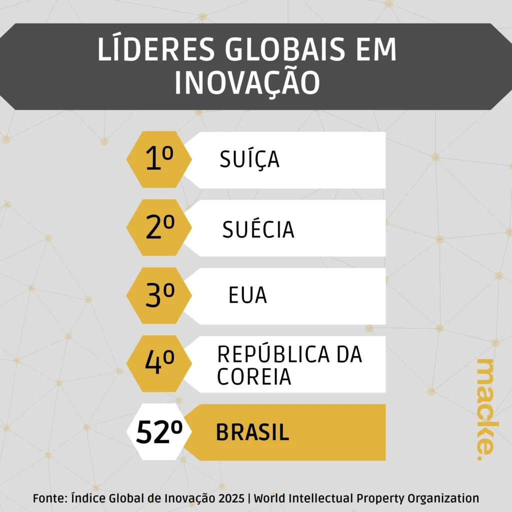 O Brasil, na 52ª posição geral, é o 2º colocado na América Latina e Caribe e apresenta um desempenho superior ao esperado para seu nível de desenvolvimento econômico. Assim como a Suíça, o país também demonstra eficiência ao produzir mais outputs de inovação (50º lugar) em relação aos seus inputs (63º lugar).