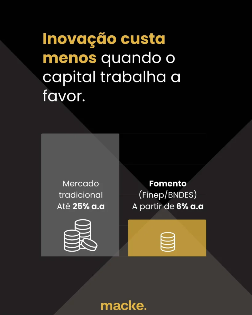 É exatamente neste cenário de juros elevados que os mecanismos de fomento à inovação, como os financiamentos da FINEP e do BNDES, se tornam uma necessidade estratégica. Essas instituições oferecem linhas de crédito com condições drasticamente mais favoráveis do que as do mercado, utilizando a Taxa Referencial (TR), que orbita em torno de 2% ao ano, como base.